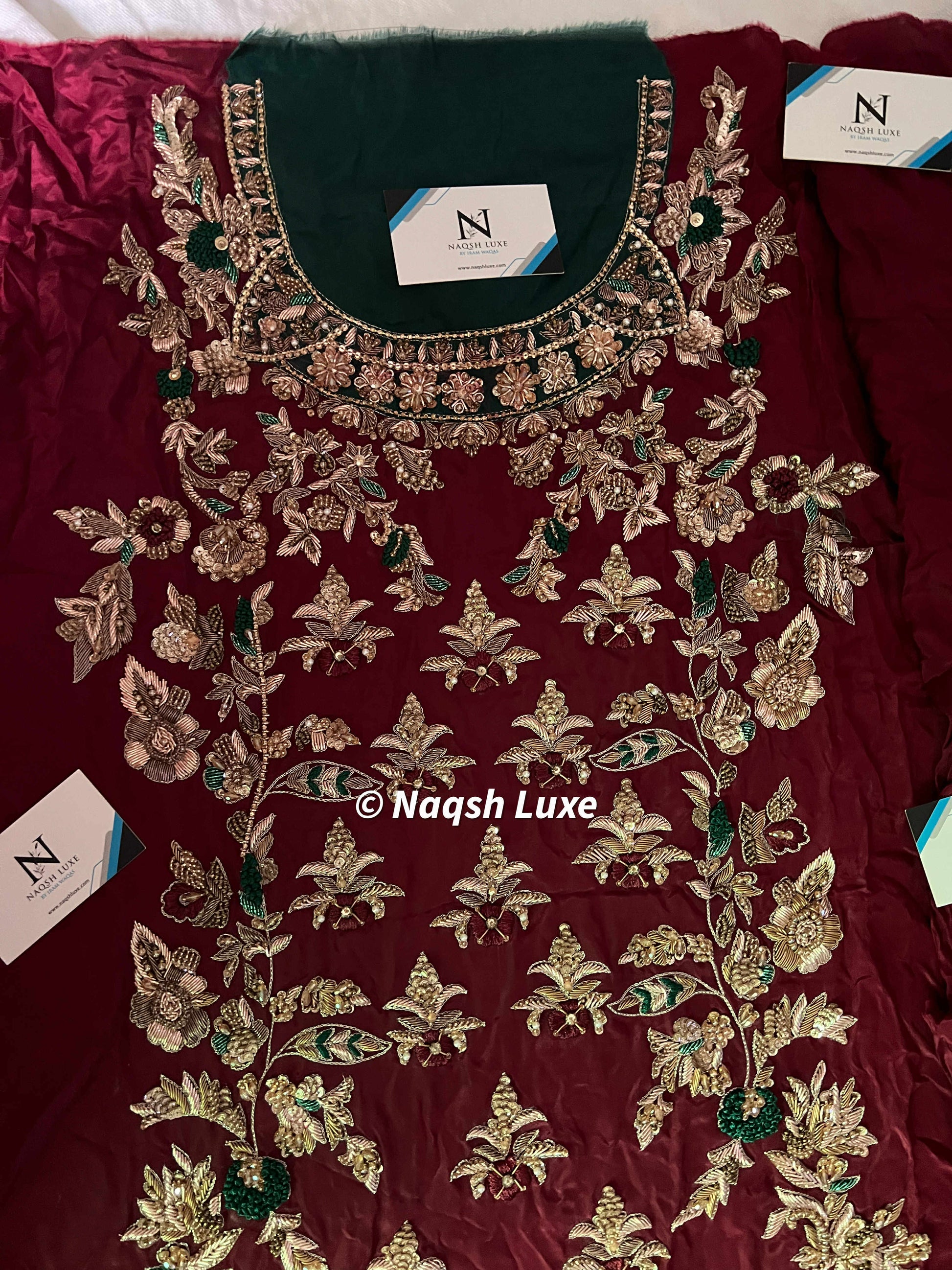 ‘The Pakistani dress is beautifully handcrafted with zari, kora, dabka, stones, pearls and sequins. All the embellishments are handsewn with double thread.
